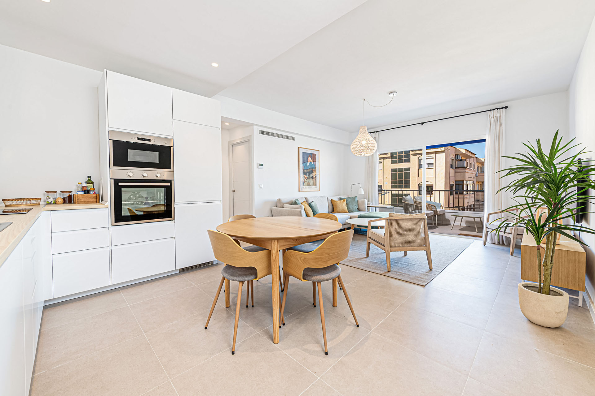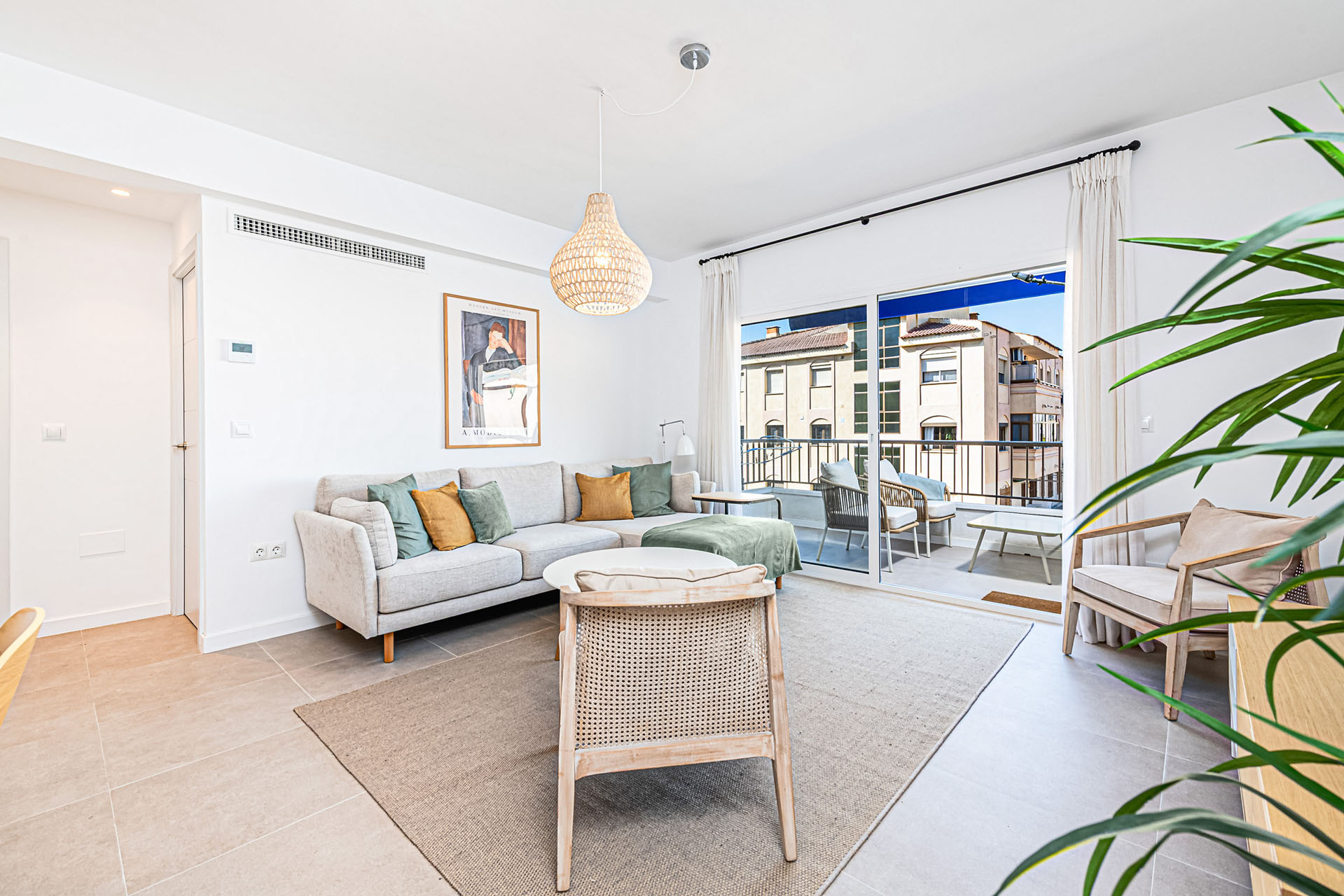 Salga a la terraza de 10m² y disfrute de la atmósfera mediterránea. El espacio exterior está amueblado con muebles de jardín, perfecto para tomar un café por la mañana o relajarse por la tarde. Aunque el apartamento no permite mascotas, ofrece un entorno acogedor para familias y parejas que buscan un retiro tranquilo.